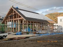 11月19日 屋根の下地板も張れて下地材のルーフィング(黒と銀色)の