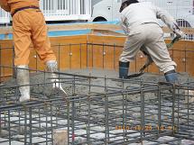 10月24日 鉄筋工事がほぼ完了しました! この状態で(財)住宅保証機構さんが鉄筋検査に来てくれます。 検査後、いよいよコンクリート打設が始まります。 10月25日 打設が始まりました。 10月25日 設計されたコンクリートの厚さを確認しながら慎重に打設を進めていきます。